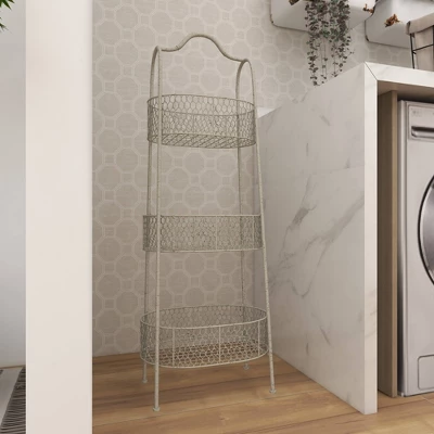 - Features a white finished 3 tier oval basket rack caged with solid framing perfect for home storage and display