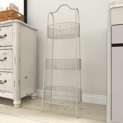- Iron is intricately sculpted to form a chic 3-tiered basket rack