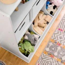 - Features twelve (12) large storage cubbies for storage of objects of all shapes and sizes