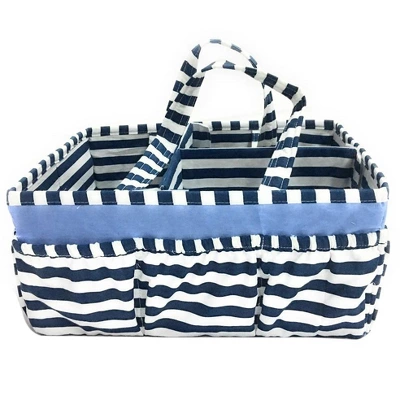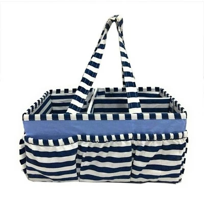 Add organization to any area of your home with the portable Nursery/Toddler Storage Caddy by Bacati. Perfect for dressers and changing stations, this lightly padded caddy has 8 outer pockets and a removable “T” separator for maximum versatility. The soft cotton percale fabric with stiffner inside keeps the shape intact, lining and handles feature a padded with polyfilled and cordinating trim. Keep diapers, wipes and other necessities tidy while traveling from room to room. Caddy also functions as an organizer for crafts, picnics, pet supplies, etc. Measures 12.5 in x 6.25 in x 8.5 in.