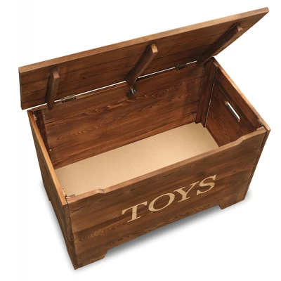 Badger Basket’s charming Solid Wood Rustic Toy Box features a classic appearance that will blend in seamlessly with your décor. Controlling clutter in your family room or kid’s bedroom is an open and shut case. Bold TOYS lettering engraved on the front exposes the plain wood for a contrasting, two-tone effect. Not using it for toys, no problem! Simply unscrew and reverse the front panel to reveal the solid text-free front. Classic cutouts add feet to the bottom and enhance the vintage, barn wood style. Quality hardware with safety support hinge holds the lid open preventing slamming, finger crushing, or pinching. Side handles make it easy to move around when cleaning the floors or rearranging furniture. Wide, open slot on the front panel under the lid is a convenient way to lift up the top, and prevent injury when shutting it. Heirloom-look surfaces are easy to wipe clean and to maintain. Wide opening allows easy access to all of the 3.3 cubic feet of space inside. Made of carbonized solid wood with an aged and distressed finish achieved with brushing, stain, or lacquer depending on the color. Bottom panel is composite hardboard. Metal hardware. Sanded and smooth edges. Overall measurements 31.5 inches L x 16.25 inches W x 18 inches H (31.5 inches H with lid fully open). Interior space dimensions: 29 inches L x 14.5 inches W x 13.5 inches H. Handle openings (each): 4.5 inches W x 1 inch H. Assembled weight: 23.1 pounds. All measurements approximate. Wipe clean with a lightly dampened cloth and mild detergent as needed and dry thoroughly. Adult assembly required. Illustrated assembly instructions included. Non-toxic finish. Product complies with all currently applicable safety and composite wood standards. Product includes a 30 Day Limited Manufacturer’s Warranty. Product may vary slightly from shown and described. Props/accessories shown are for illustration purposes only and are not included with the product. Actual color/finish may vary slightly from screen display. This item ships in its original carton that may include a product photo. Some soft plastic/rubber toys (such as balls) can react with and cause damage to the finish when left in prolonged contact. Be mindful of what is stored in the unit and regularly check toys and the unit to prevent damage.