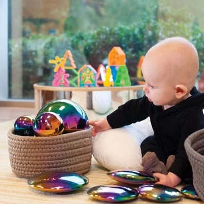 Soft woven basket with lid can be used for a variety of activities or as storage. Children will want to open the lid and investigate contents of the basket making it perfect for a game of peekaboo or a treasure hunt with loose parts and heuristic sets. Basket measures 9″. Made of soft, durable 100% polypropylene, baskets are stain, mildew and fade resistant. Spot clean or professional dry cleaning is recommended. Contents not included.