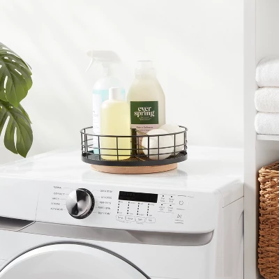 Store everyday items on a countertop while keeping them easily accessible with this Wire Divided Turntable with Natural Wood from Brightroom™. This divided turntable has a round silhouette that makes it ideal for organizing condiments in the refrigerator and household items in the bathroom cabinet. This decorative storage basket has a open black wire design with wooden base that adds a new level of stylish convenience to your home. Simply spot or wipe clean to keep it looking great.