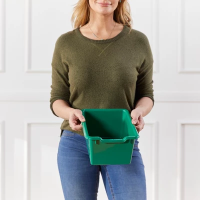 Keep your classroom and home organized, tidy, and efficient with ECR4Kids Scoop Front Storage Bins. The sturdy plastic bins are designed for everyday use to keep small items contained off the floor. Teachers, educators, and parents can utilize bins to store books, toys, manipulatives, and games. The open bin design displays and provides easy access to contents. Organize stories and label bins by reading level, theme, or holiday, encouraging children to independently select their favorite story and clean up during playtime. Personalize trays in classroom cubbies for children to store art projects, individual items, homework, and more. The Scoop Front Bins provide a flexible storage solution with endless possibilities for use from the garage to the kitchen pantry, or nursery. Durable plastic bins feature rounded edges, an easy-to-grasp scoop front handle, and a curved interior to simply remove contents. Lightweight bins are easy to pick up and carry, transporting from a storage cabinet to a play space. Bins nest to save space, and built-in stack supports prevent locking when empty. Use as standalone storage or pair with ECR4Kids storage lockers, cubby units, or tray cabinets; sold separately.