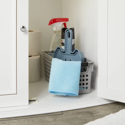 Create a customized organization system for your bathroom, laundry room, closet, mudroom, and home with this set of 4 grey storage containers. Use the versatile plastic baskets for organizing cleaning supplies, linens, makeup, toiletries, and towels. Each small grey plastic bin measures 11.5 x 5.25 x 5 inches with built-in handles that ensure quick and easy accessibility.