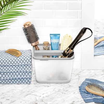 Clear up vanity space and safely store cooling hot tools with madesmart’s® Hanging Hair Tools Organizer. The uniquely shaped organizer fits perfectly over towel bars and cabinet doors, or sits elegantly on the vanity providing a consolidated storage space for hair tools and other styling accessories. Heat-safe silicone lines compartments and edges providing grip and protection. Unplug hot styling tools before storing.