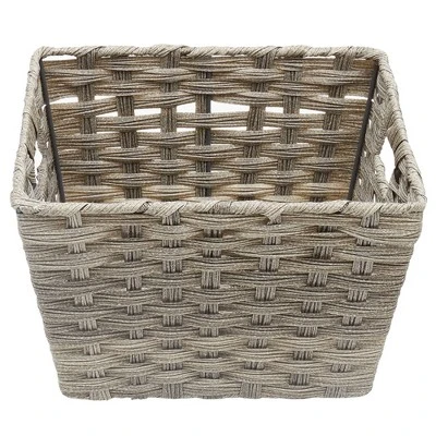 Weaving together the luxurious good looks of authentic rattan with the exceptional resiliency of plastic, the faux rattan basket provides stylish and practical storage for all your essentials. Organize every room in the house and increases storage on shelves, dressers, and cabinets, dresser tops and desks. Prop this decorative basket on top of a countertop as an elegant gathering spot to corral mail, keys, or loose change. Or set on bathroom shelf to keep toiletries and bath accessories within reach. With sturdy plastic strips tightly woven over a metal frame, the basket is well-designed to keep things like small toys from slipping through. The surface of the basket is invitingly smooth to the touch making it a true pleasure to tote around the house. Stylish storage for every room in the house, look no further than this rattan-like basket to keep clutter under control. Easy to maintain, simply wipe with a clean cloth to keep it looking at its best. Item dimensions may differ slightly due to the unique nature of the product. Color and finish may differ slightly due to differences in monitor displays. Props and accessories are not included.