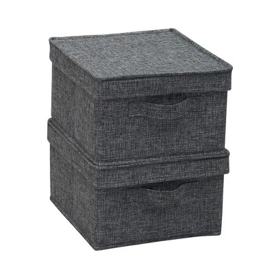 This set of 2 Medium Storage Boxes with Lids from Household Essentials is sure to keep any room organized. They can hold a variety of items from small to bulky, such as linens, sewing supplies, clothing accessories and much more. The boxes’ exterior lining is made of a luxe, poly blended fabric. The sides are reinforced to support the contents inside and allow the bins to be stacked to save space. Their stylish trim makes these bins attractive, without detracting from existing decor or styles. These storage boxes are a space-saver when not in use; the boxes fold completely flat to be stored away until needed. Use this pair of storage boxes anywhere in your home, office or dorm for elegant storage and organization. This Medium Storage Box set pairs well with any decor style and can be used in a variety of ways throughout your home.