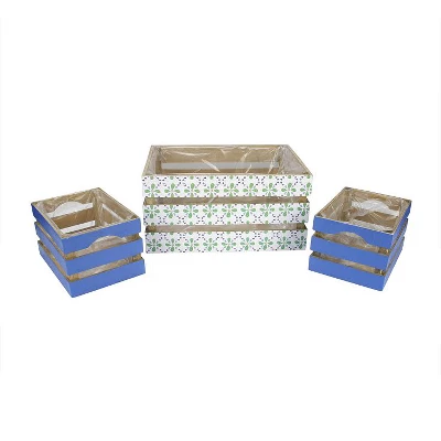 From the French Countryside Collection This set of 3 decorative rectangular storage box nesting crates is a creative way to add storage space and design in any room of your home Large crate has a blue, gray and green flower and dot pattern while the 2 small crates are a cornflower blue color Each crate has built-in handles and a plastic lining to keep small items from falling out Recommended for indoor use only Dimensions: Small: 4.75″H x 7.75″W x 6″D Large: 6.75″H x 13.5″W x 9.25″D Material(s): plywood/plastic