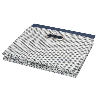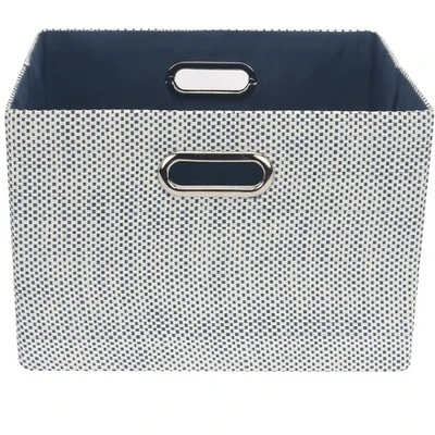 This sturdy storage basket is the perfect addition to your childβs nursery or playroom. It is made of blue and white cross weaved straws and has a nice blue polyester lining inside. There are two silver handles on the sides for carrying. It easily folds up for compact storage when not being used. It is sized at approximately 12 1/2β X 11β X 9β. Spot clean only