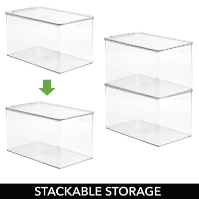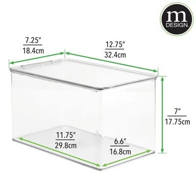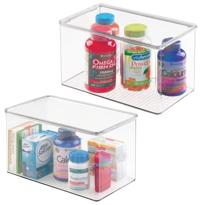 The mDesign Bath Storage Box makes it simple and easy to store and organize everything from bars of soap, sponges, makeup, cosmetic supplies, first-aid like bandages, adhesive tape and gauze to nail care including clippers, polish, emery boards, lacquers, bath salts, loofahs and more. The recessed lid makes this bin conveniently stackable, and the clear surfaces make it easy to see what is stashed inside so you can quickly grab what you need. Mix and match with other mDesign bins to create a custom storage solution for your home.