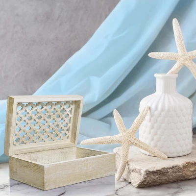 - This Wooden Storage Box stands out in its intricate hand-carved trellis design and finish