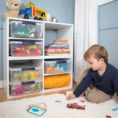 When clutter threatens to take over your space, reign it in with help from the 4-pack of Rubbermaid Cleverstore 41-Quart Plastic Storage Containers. This clear storage bin makes it easy to organize your things and see exactly where they are.This storage box overall measures 29.00 inches long and 17.75 inches wide. With a 41-quart capacity and a shallow 6-inch height, this storage container is great for storing small items. Papers, art supplies, kitchen spices, hats and gloves, toys, office supplies, and more will fit inside the latching tote. You can conveniently see what you stored in the bin thanks to the clear sides and see-through lid. This plastic storage container’s lid makes for both easy transport and convenient storage. By simply snapping the latching lid into place, your valuable items stay safe inside the storage tote. The recessed design of the heavy-duty lid allows for effortlessly stacking storage bins in your closet, garage, or storeroom. This will help keep your space looking neat and tidy.Keep your items organized. With the 4-pack of Rubbermaid Cleverstore 41-Quart Plastic Storage Containers, there’s a place for everything.
