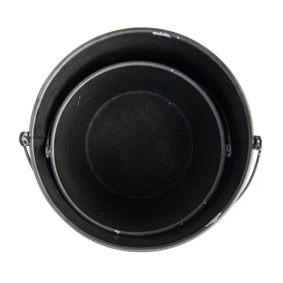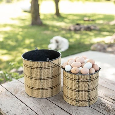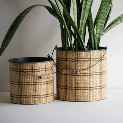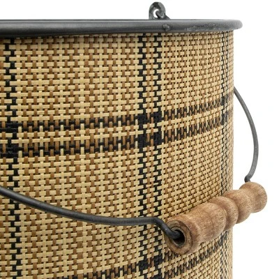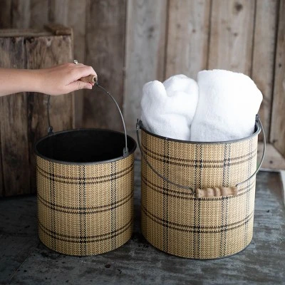 Keep your home organized and stylish with a set of two bins from Foreside Home & Garden. Made of sturdy metal and finished with a classic plaid patterned brown and black woven paper wrapped around the exterior. The stunning gunmetal finish inside coordinates with the handles that are accented with a warm, turned wood handle. These traditional baskets are the perfect accent to any space needing a bit of a natural flair. Creating an organized yet beautiful home is easy with these baskets.