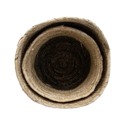 Natural and textural, this set of two handwoven baskets from Foreside Home & Garden will make a statement. The two different sizes make them a great companion for potted plants, books, or other small items. Hand crafted from two tones of maize rope and wrapped with fringe trim to infuse a boho vibe.