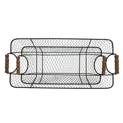 Maintain an organized home in style with the set of two oblong baskets from Foreside Home & Garden. These traditional wire baskets are each a different size, allowing them to be nested when not in use. Their sleek black finish and updated take on chicken wire, paired with the turned wood handles allow them to blend into any space with ease. A unique tapered shape offers a spot for small potted greens or gardening tools. Keeping your home organized and on trend has never been easier than with this set of baskets.