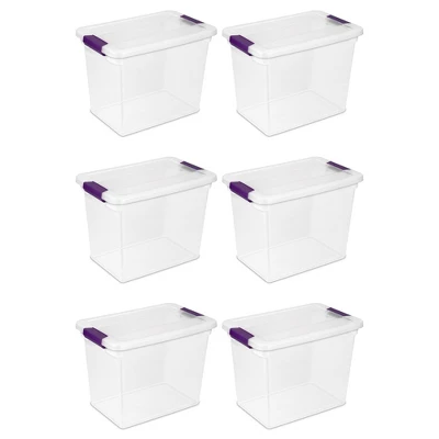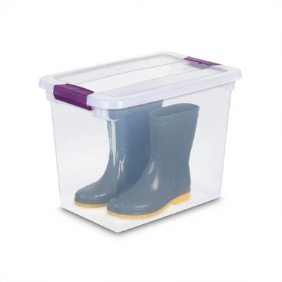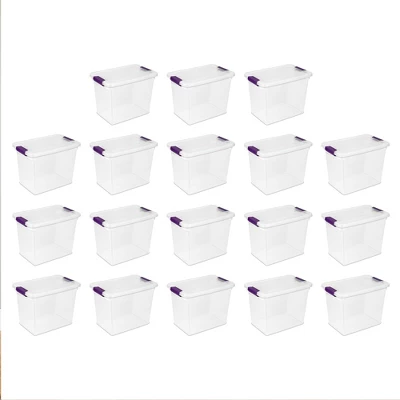 The 27 Quart ClearView Latch Box features ergonomic latches that attach the lid securely to the base, yet are still easy to unlatch. The see-through base and lid allow contents to be easily identified from any angle, and multiple bases are able to stack on top of each other. This latch storage box is ideal for storing blankets and other bulky items around the home. Sterilite ClearView Latch Boxes feature contemporary styling with ergonomic, color coordinated latches. The see through design allows for easy viewing of items. Indexed lids allow containers to stack securely for efficient storage. Common lids are used on select sizes to simplify and improve organization. Latch color adds visual appeal to everyday assortment.