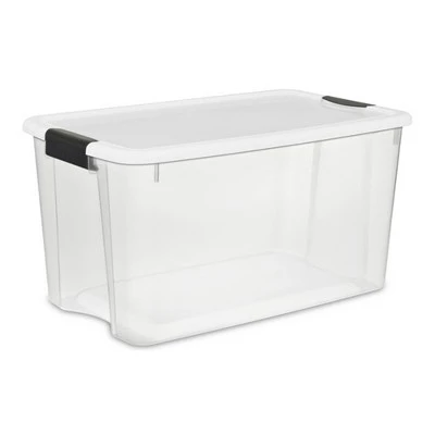Whether you need to pack away camping gear, blankets, or other bulky items, keep your home neat and organized with the help of the Sterilite 70 Quart Ultra Latch Storage Box (4 Pack) & 64 Qt. Container (6 Pack).Both of these storage boxes feature durable latches that attach the lid securely to the base to ensure that contents remain secure when stored. The see-through bases allow contents to be easily identified. The multiple bases are able to stack on top of each other. These latching storage boxes are ideal for storing items in the basement, garage, and attic. Keep winter coats or spare linens dust free and neatly organized in a closet so they are easily accessible when needed. The innovative latch design provides a rugged comfortable grip surface for securely latching the lid to the base.Clear some clutter from your life and tuck away your belongings in the 70 Quart Ultra Latch Storage Box (4 Pack) & 64 Qt. Container (6 Pack) from Sterilite.