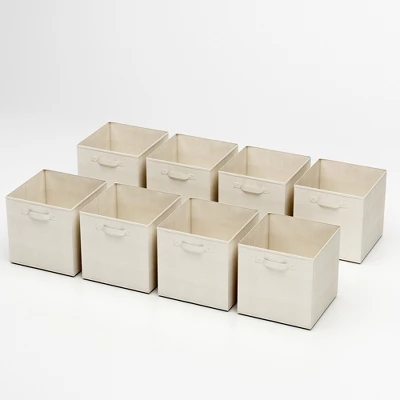- PRODUCT DETAILS – Materials: Non-woven Polypropylene and Cardboard. Dimensions: (L) 11.15″ x (W) 10.5″ x (H)10.5″. Includes 8 Foldable Storage Cubes. Color: Beige.