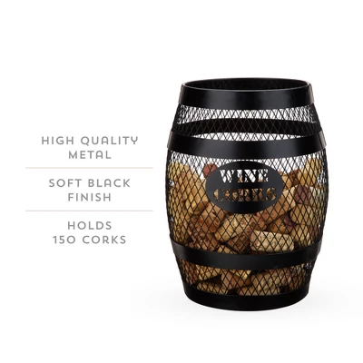 Form and function intertwine to create this metal cork holder. Its quaint wine barrel shape, sleek black finish, and clever label are all sure to charm. Holds up to 150 corks to satisfy even the heartiest wine lovers. Crafted from sturdy metal. Makes a great gift for design-conscious wine lovers. Holds 150 corks, measures 9.5″ H x 6.75″ W, cage design.